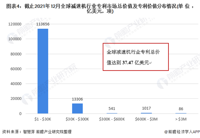 目前,全球減速機行業(yè)專利總價值為37.47億美元。其中,3萬美元以下的減速機專利申請數(shù)量最多,為11.37萬項;其次是3萬-30萬美元的減速機專利,合計專利申請量為1.33萬項。3百萬美元的減速機專利申請數(shù)量最少,為86項。