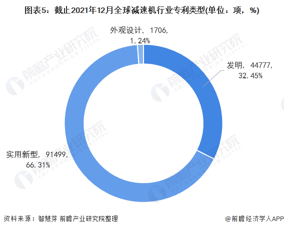 在專利類型方面,目前全球有9.15萬項減速機專利為實用新型專利,占全球減速機專利申請數(shù)量最多,為66.31%。減速機發(fā)明專利和外觀設(shè)計型減速機專利數(shù)量分別為4.48萬1706項,分別占全球減速機專利申請數(shù)量的32.45%和1.24%。