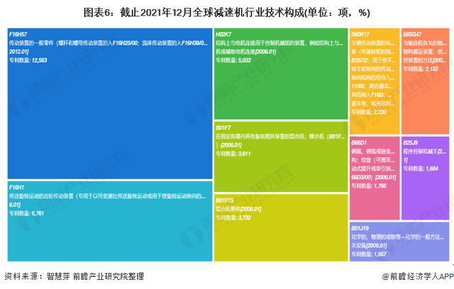 從技術(shù)構(gòu)成來看,目前“F16H57傳動裝置的一般零件(螺桿和螺母傳動裝置的入F16H25/00;流體傳動裝置的入F16H39/00至F16H43/00)”的專利申請數(shù)量最多,為12563項。其次是“F16H1傳送旋轉(zhuǎn)運動的齒輪傳動裝置(專用于以可變速比傳送旋轉(zhuǎn)運動或用于使旋轉(zhuǎn)運動換向的入F16H3/00)”,專利申請量為6761項。