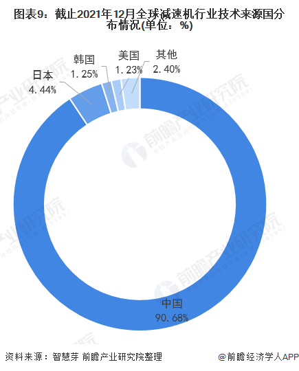 目前,全球減速機第一大技術(shù)來源國為中國,中國減速機專利申請量占全球減速機專利總申請量的90.68%;其次是日本,日本減速機專利申請量占全球減速機專利總申請量的4.44%。韓國和美國雖然排名第三和第四,且兩者的專利申請量差距不大。