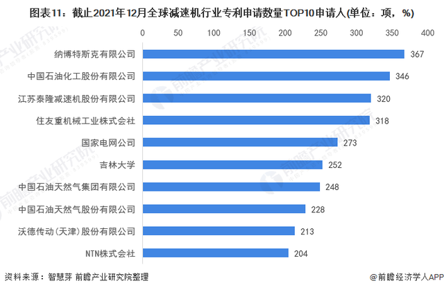 其中,納博特斯克有限公司減速機專利申請數(shù)量最多,為367項。中國石油化工股份有限公司排名第二,其減速機專利申請數(shù)量也達到346項。